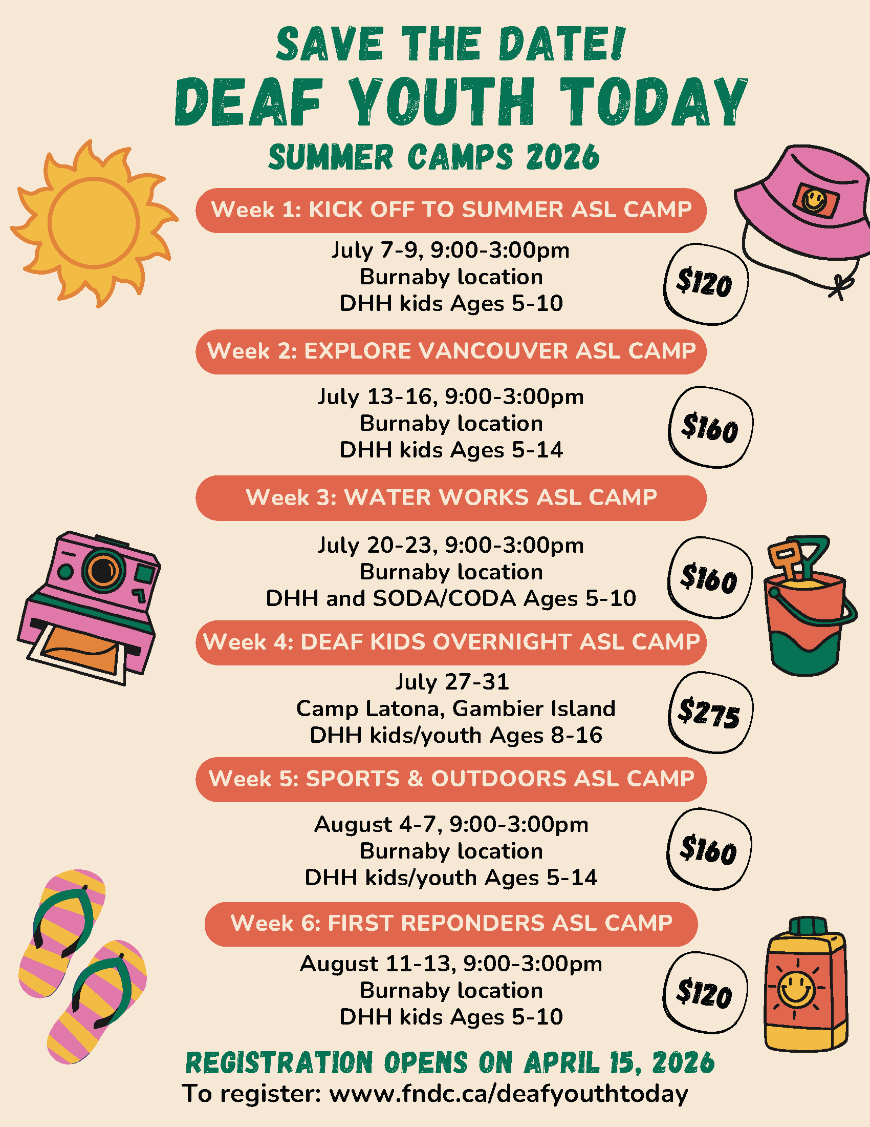 Deaf Youth Today (DYT) is our child and youth program dedicated to providing rich American Sign Language (ASL) experiences for Deaf kids and teens across British Columbia. At DYT, young people thrive in a welcoming, Deaf-centered environment, forming meaningful friendships, feeling genuinely included, and growing in confidence. Guided by passionate Deaf adult mentors, participants build essential life skills such as leadership, problem-solving, resiliency, and self-advocacy, while significantly enhancing their ASL proficiency. These valuable skills empower them to become confident, independent, and capable individuals.